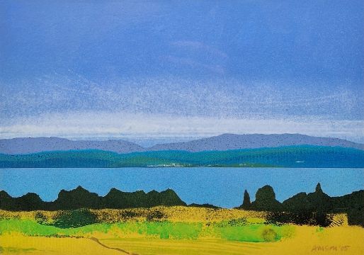 AMSM (20th century) Mixed media and collage "Towards Nyon, Lac Leman", signed AMSM and dated '85 lower right, framed and glazed, 20cm x 28.5cm