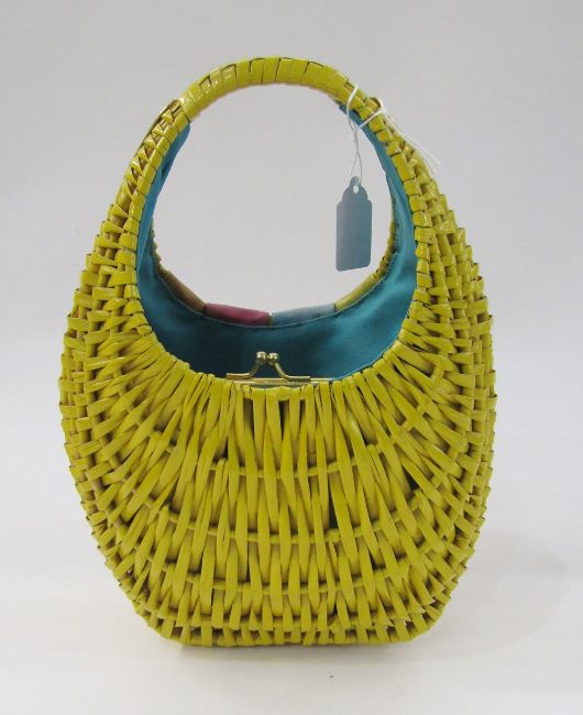 1950's Koret yellow wicker egg-shaped bag fitted integral purse and turquoise lined interior, having four leather and gilt metal tabs, four gilt metal stud feet, 25cm high and a pink and green handbag in the style of Paco Rabanne 1960's (2)