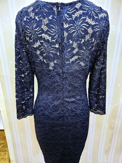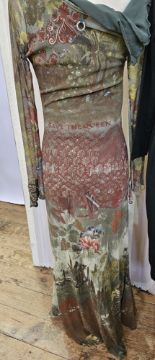 Midnight blue lace cocktail dress, a black Paul Costelloe black label jersey wool wrap dress, V-neck with leather buckle fastening to the side, and a Save the Queen printed nylon maxi dress with birds, leaves and figure, full-length net sleeves (3)