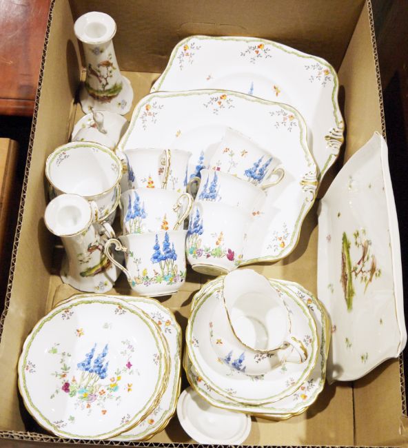 Tuscan china Plant pattern part tea service, a Crown Devon Stockholm part dinner servicea small collection of Keele Street Pottery Co cottageware teapots, and other items (3 boxes)