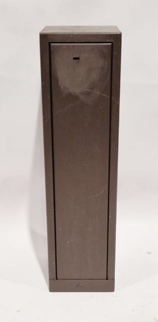 Narrow brown-painted metal gun cabinet (H 86.5cm x W 23cm x D 24.5cm)