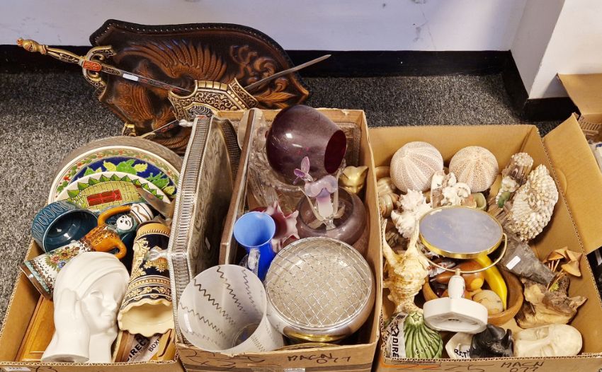 Various seashells to include two sea urchins, a wooden bowl with carved wooden fruit, a tree root carved and adorned with wood mushrooms, a model of an owl formed and decorated with seashells, a silver-coloured metal rose bowl, a magnifying mirror, a large silver-coloured metal photo frame, a silver-coloured metal tray with gallery, on four ball and claw feet, a stein and other collectable items to include an embossed leather shield, cross swords and a breast plate wall hanging