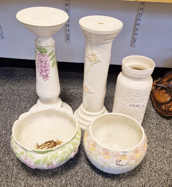Two ceramic jardinieres, bowls on matching stands, one decorated with lilacs, the other with roses and a large ceramic umbrella stand (3)