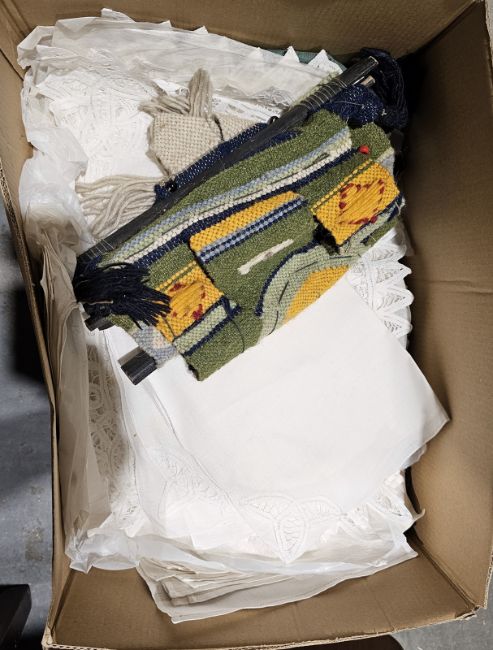 Assorted table linen to include napkins, damask, crocheted etc. (1 box)