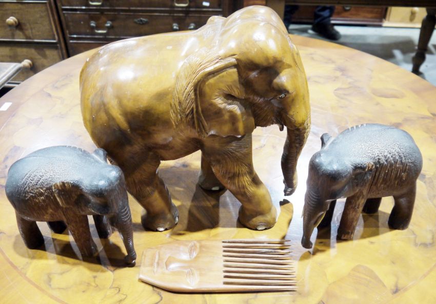 Large carved wooden elephant and two smaller wooden elephants, and a wooden carved comb (1 box)