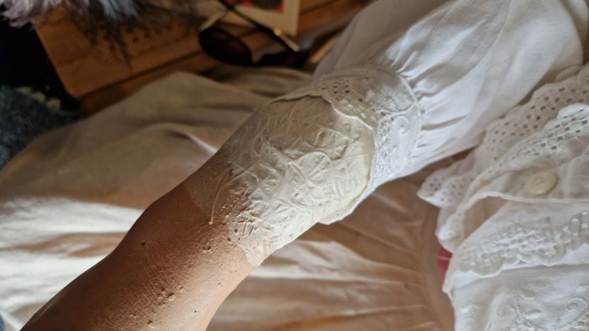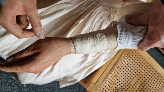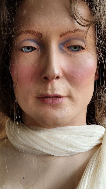 Surface marks and scuffs. Some losses to the paint, crack to the neck, repairs to the arms. General wear and tear.