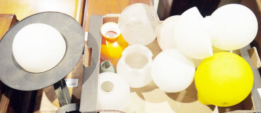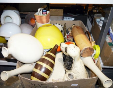 Various light shades, a large ceramic model of a Cocker Spaniel, an Apollinaris-Brunnen-M-W antique German stoneware mineral water bottle, and other items (2 boxes)