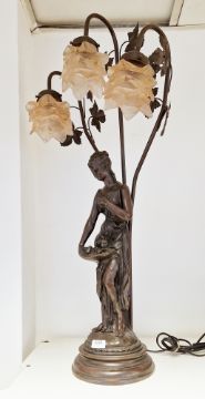 Large contemporary bronzed metal Art Nouveau-style figural three-light table lamp, cast as a maiden holding a basket of fruit before three leafy tendril branches issuing three pink-tinted petal-moulded glass shades, on domed base, 81cm high overall