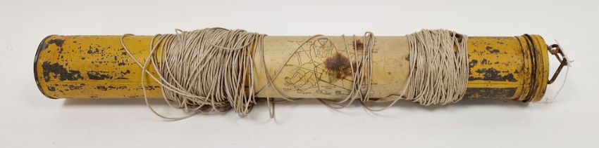 WWII period RAF emergency kite within a yellow painted cylindrical tin applied with printed linen instructions