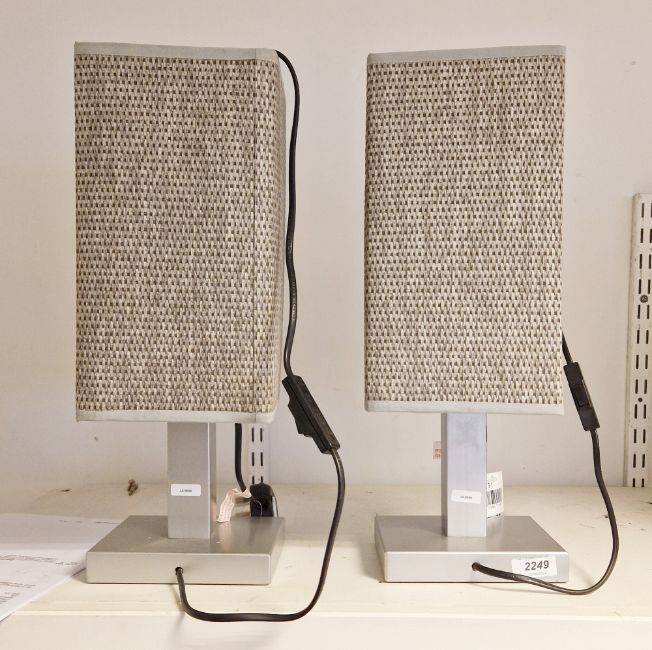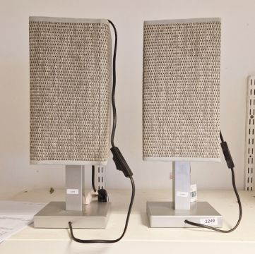 Pair of contemporary silver-painted table lamps and a contemporary Philippines basket-woven square section table lamp, the first with silver colour square section shades, on column bases, the other with basket woven base, 35 cm high exc. fittings (3)