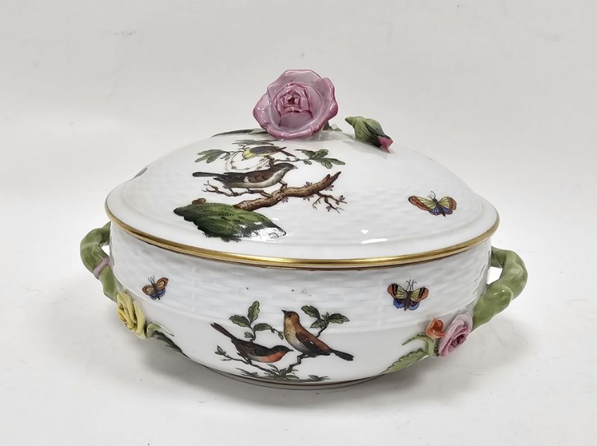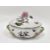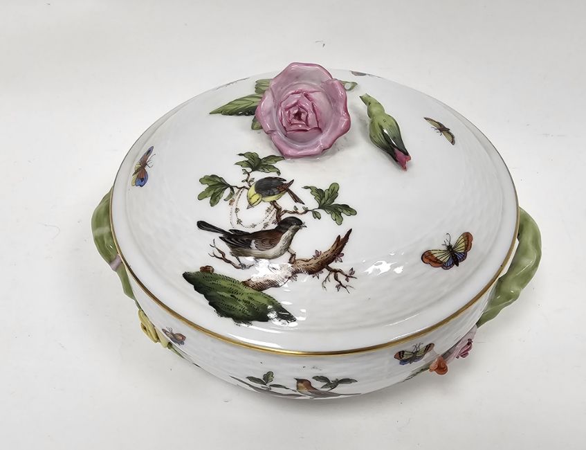 The finial with a section of the stem of the rose bud lacking, the tip of the rose bud finial is chipped and overpainted, although this is glazed and occured at time of manufacture, one of the yellow roses to one handle terminal is chipped, otherwise it is in good order and the enamels and gilding are also in good order.