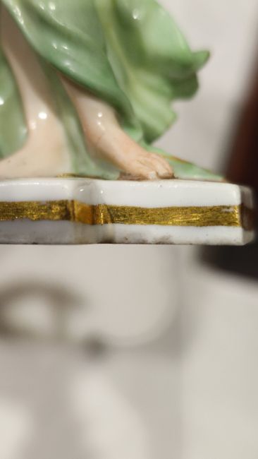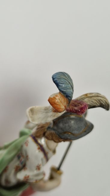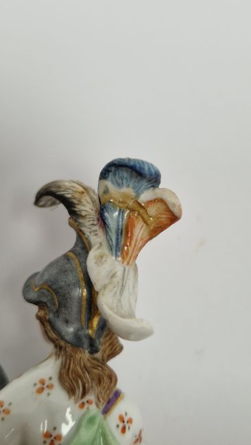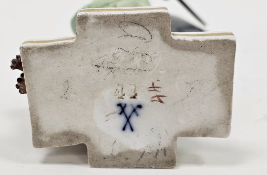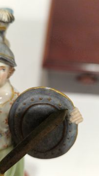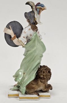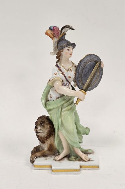 Late 19th century Meissen miniature mythological figure, she modelled in plumed helmet holding sword and shield, before a lion, on gilt line crossed-shaped base, impressed and incised numerals, blue crossed swords marks, 11cm high Condition Report Repair and loss to the feathers on the helmet, small chip to edge of shield, two small chips to the base. General wear and tear.