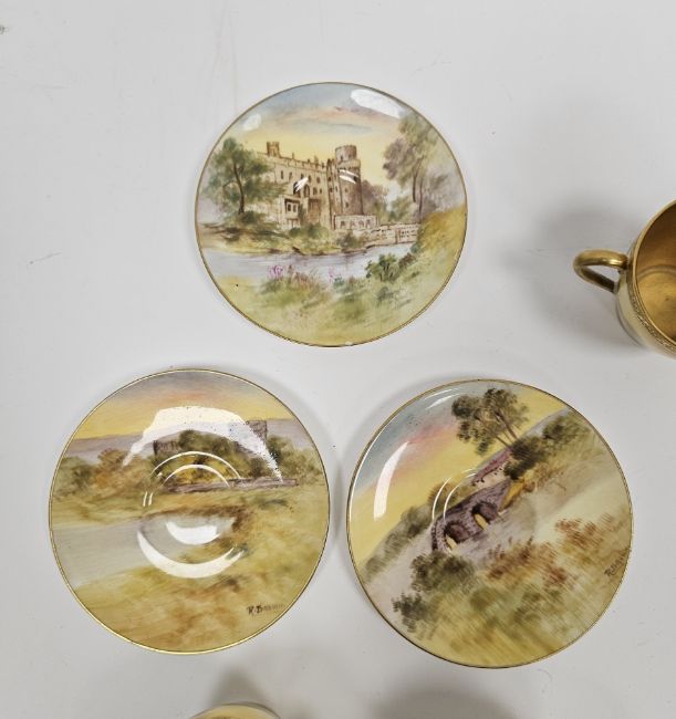 Limoges D&C footed tazza, gilt with neo-classical swag border, three Royal Doulton bone china cabinet cups and saucers painted by R Brown with rural landscapes and inns, a 19th century Staffordshire porcelain teacup and saucer painted with grey flower sprays and a two-handled shaped rectangular dish painted with interlocking garlands of forget-me-nots, various printed and painted marks