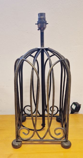 Contemporary bronzed wrought-iron style cagework table lamp, with scroll square section, cage and bun feet, 35cm high