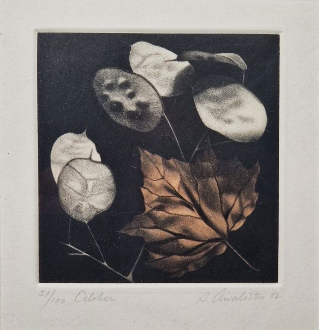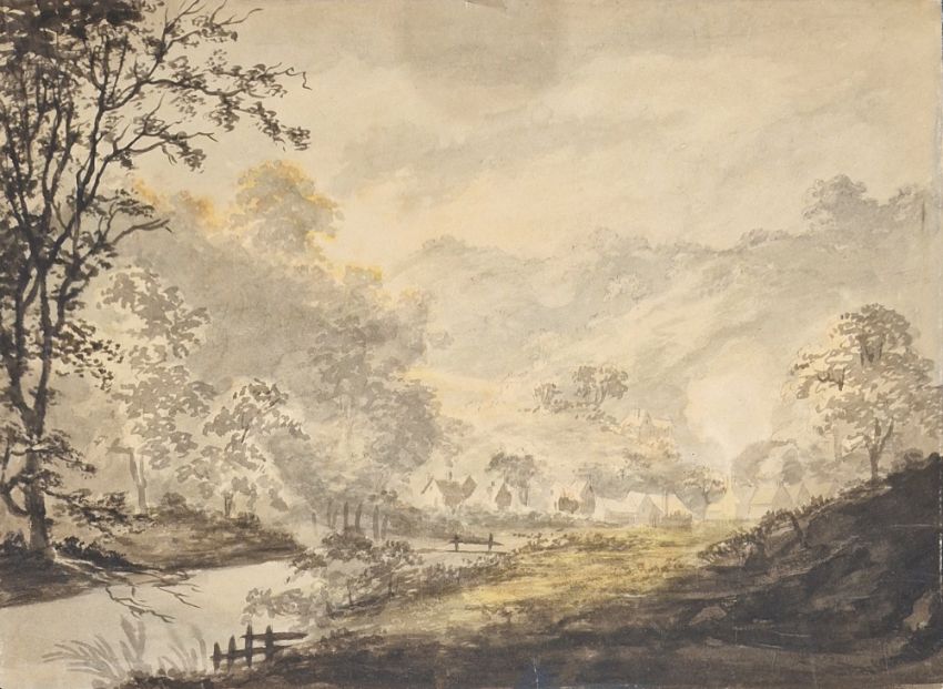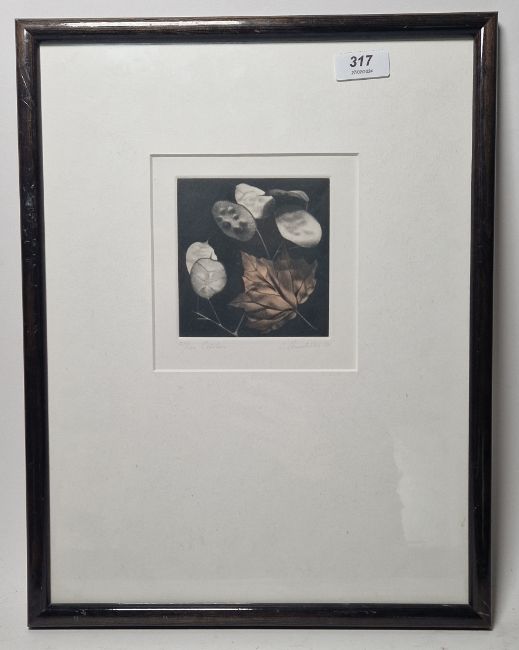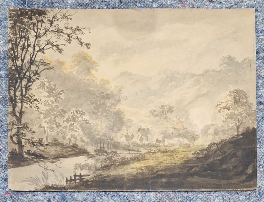 20th century school Etching & aquatint "October", study of some leaves, indistinctly signed and dated '82 lower right, limited edition numbered 51/100, framed and glazed image size 14cm x 13.5cm          18th/19th century school Watercolour Rural scene with river and dwellings, inscribed "painted by R.R. Reinagle" (Ramsay Richard Reinagle RA, 1775-1862) verso, unframed, 27cm x 36.5cm (2)