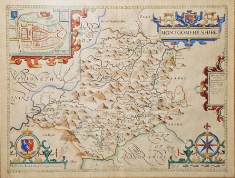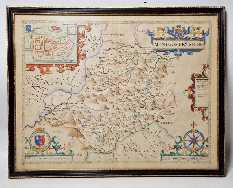 John Speed (1552-1629) Hand coloured engraved map "Montgomery Shire", published Henry Overton, inset town plan of Montgomery, strapwork cartouche, compass rose and mileage scale, Hogarth framed and glazed, image size 41.5cm x 54cm