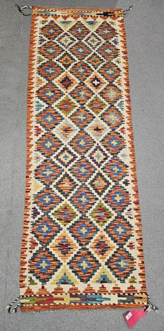 Chobi kilim cream ground runner, with three rows of ten and two rows of nine lozenges, flanked by signle geometric border, 195cm x 65cm