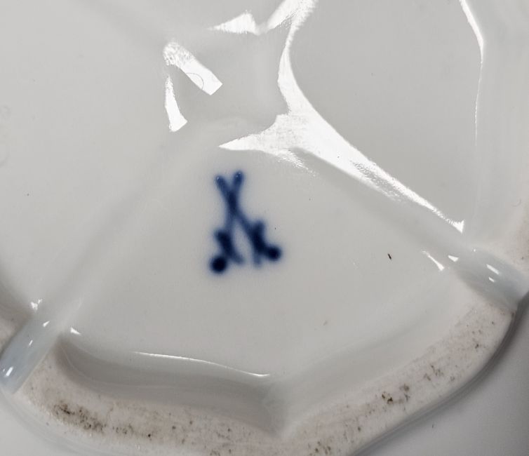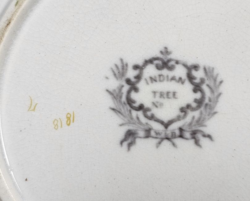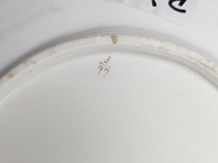 19th century English porcelain part dessert service in the Rockingham-style, painted with bouquets of flowers within grey borders, gilt with leafy tendrils, pierced grey borders, pattern no. gilt/377, a pair of Staffordshire-style models of recumbent dalmatians, a late 19th century Meissen blue ground cabinet cup and saucer, of fluted form, painted with bouquets of flowers within gilt scroll cartouches, blue cross swords marks and impressed numerals (damages), various items of Staffordshire pottery and stone china painted in the famille rose palette, three Chinese export porcelain small plates, late 18th century, painted with baskets of flowers within floral borders and other items (damages)