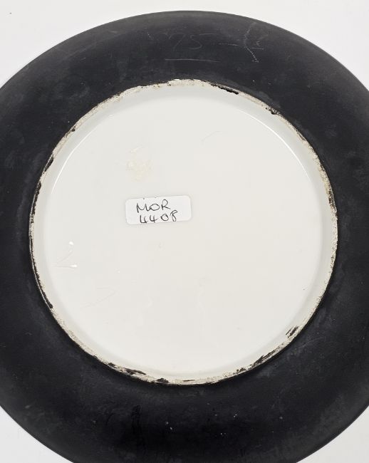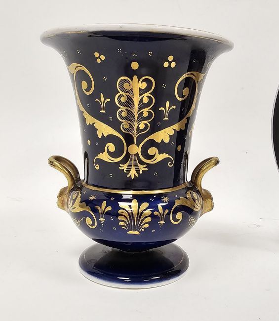 Early 19th century English porcelain dark-blue ground campana vase and a French porcelain matt black-ground portrait cabinet plate, the first painted with a landscape with richly-gilt mask handles, 14.5cm high, the plate painted with a portrait of a Roman soldier on gilt ground, incised 27, 20cm diam.
