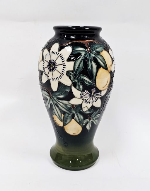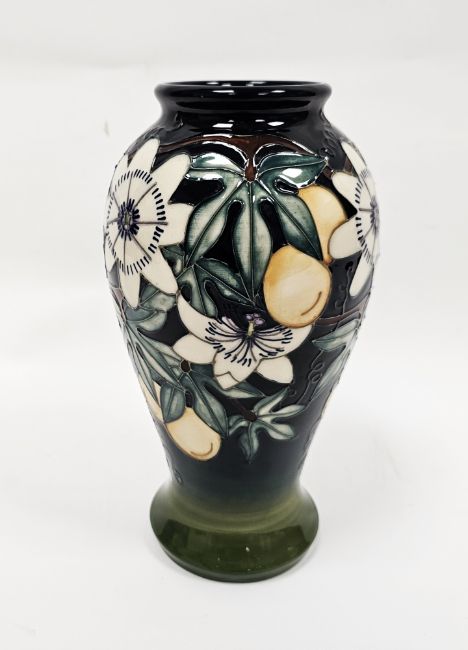 Moorcroft 'Passion Flower' pattern everted baluster vase, designed by Rachel Bishop, printed and painted marks, circa 1997, tubelined with fruiting and flowering passion flower, on a mottled green ground, 27cm high