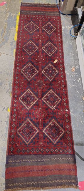Meshwani runner having two rows of five lozenge-shaped medallions to the red ground, stylised flowerhead border 248cm x 62cm