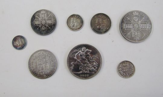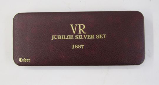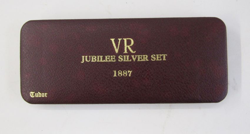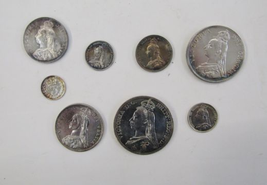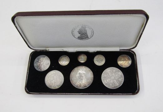 Victoria 1887 specimen set, Crown to Threepence, coins held in hinged box, coins have previously been cleaned, now toning down, various grades.