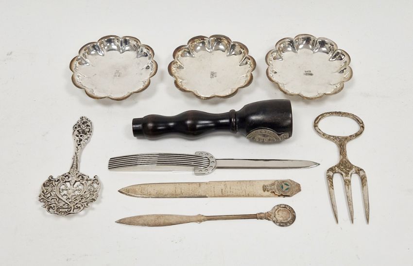 Set of three Chinese white metal pin dishes, each with character mark to the centre, gross weight 157g, a continental letter opener stamped 'silver, a pierced silver spoon and other items