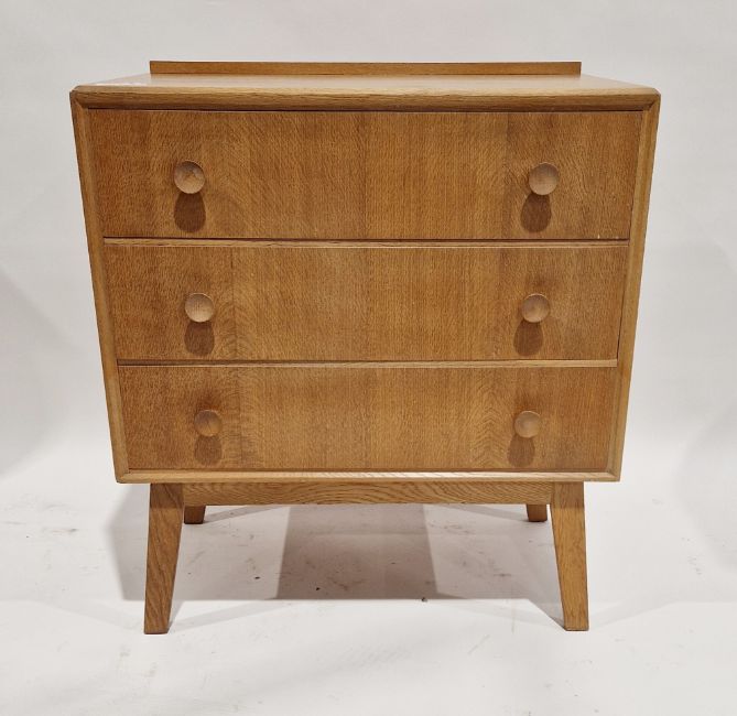 Meredew mid century golden oak chest of drawers with three long graduating drawers with turned wooden handles, on splayed feet, 84cm high x 77cm wide x 46cm deep