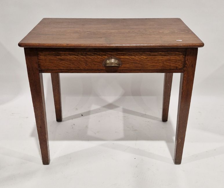 Oak side table with single long drawer having brass cup handle, on square tapering supports, 77cm x 92cm x 60cm