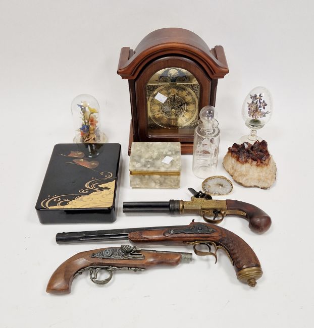 Display of dried flowers under glass dome, mid century, a gilt painted quartz geode, an onyx gilt metal mounted rectangular box and cover, a display of cloisonne and simulated pearl flowers within egg-shaped glass dome, a Japanese lacquered box and cover, a glass miniature model of the Mary Rose in a cylindrical bottle, a Bentima arched rectangular mantel clock with gilt metal dial and three reproduction flintlock pistols