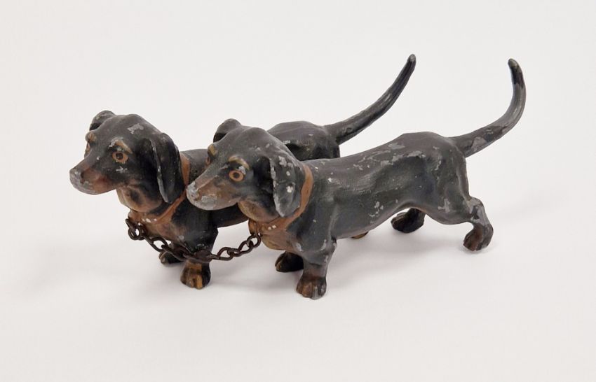 Austrian-style cold painted cast metal pair of dachshunds, early 20th century, each cast standing astride, joined by a chain to their collars, 11cm long