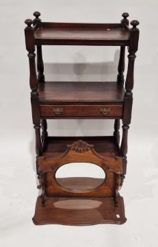 Edwardian mahogany wall bracket with oval mirror and single shaped shelf, 57cm wide and a Victorian mahogany whatnot having three-quarter tray top, single drawer and all on turned baluster supports, brass caps and ceramic castors, 111cm high x 60cm wide x 40cm deep