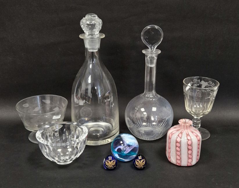 Assorted items of glassware including a Murano latticinio cylindrical flask with pink and gold aventurine ribbon alternating with latticinio gauze, applied with label (cracked and repaired), a 19th century continental wine glass engraved 'Marianna' flanked by fruiting vine, a magnum decanter with crown stopper, a globe-shaped decanter and flat stopper, a Orefors cut glass footed engraved bowl, a Caithness streamers pattern paperweight, two Faberge-style bohemian blue tinted cut glass miniature eggs with cyrillic cyphers for Catherine the Great and Alexander II, each with imperial eagle enriched in gilding
