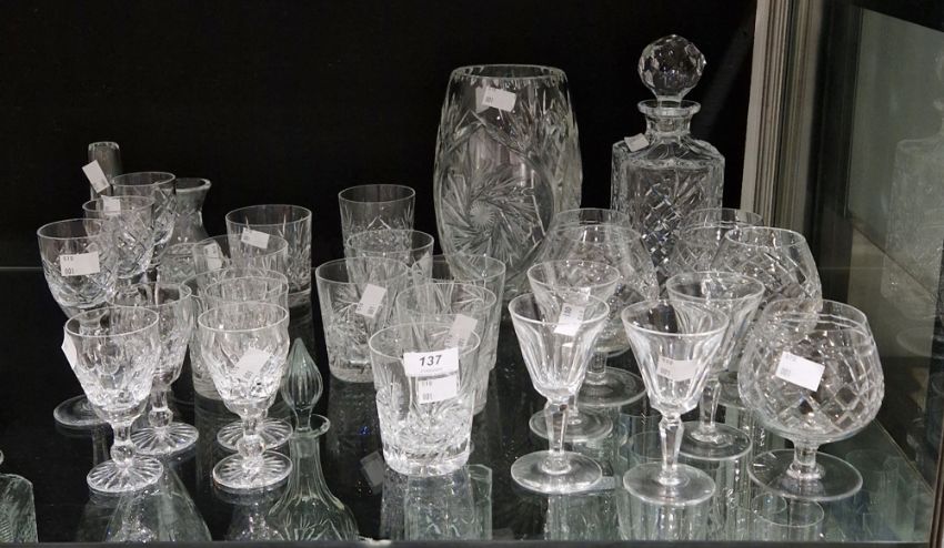 Various items of cut glass tableware including wine glasses in sizes, brandy balloons, water tumblers, a square section whisky decanter and faceted stopper, an oviform cut glass flower vase, a spill vase and other items