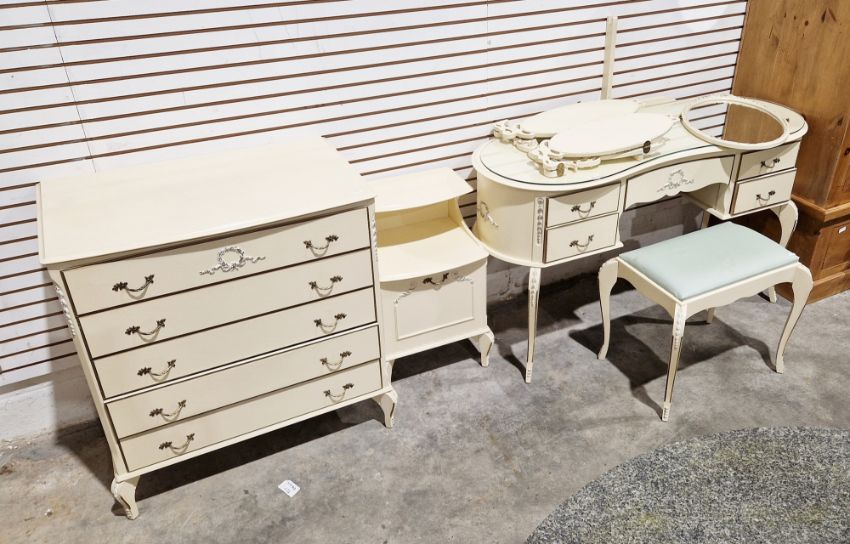 Mid-20th century cream and gilt-painted Louis XV-style bedroom suite of four pieces viz:- kidney-shaped dressing table with triple folding mirror, stool, bedside table and chest of five long drawers each with pair brass twisted loop handles