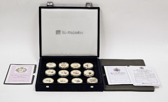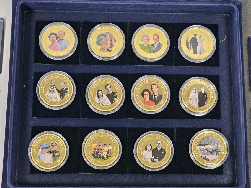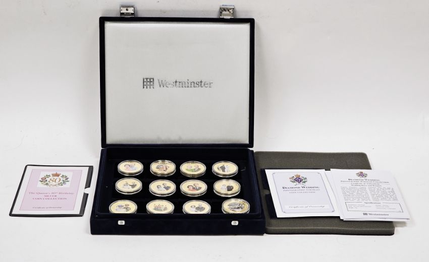 Westminster collection gilt cupro-nickel coins commemorating the diamond wedding photographic portraits (12) with certificates of authenticity and velvet box of issue, hinge broken