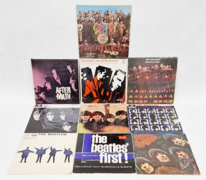 Collection of vinyl LPs to include the Beatles Sgt Pepper PCS7027 (YEX637/637/1) (scratched side 1 and sticky tape residue); Rubber Soul PMC1267 (XEX579/580-5), The Beatles First Polydor 46432; Help! PMC1255; A Hard Day's Night PMCS230 (torn sleeve); Beatles for Sale PMC1240; With The Beatles PMC1206; and Rolling Stones, Aftermath LK4786, The Peddlers, Live at the Pickwick and the Pentangle, Basket of Light TRA205 (10) (all are generally poor to fair condition)