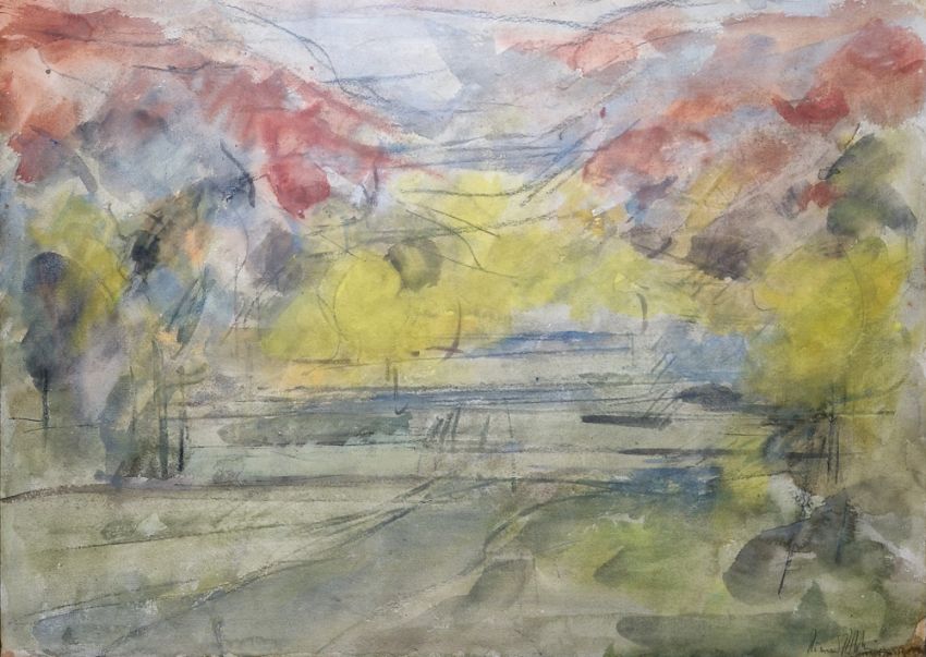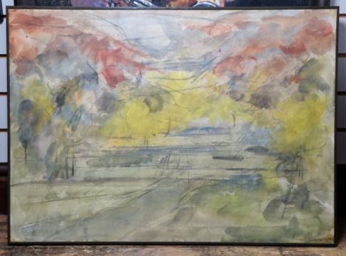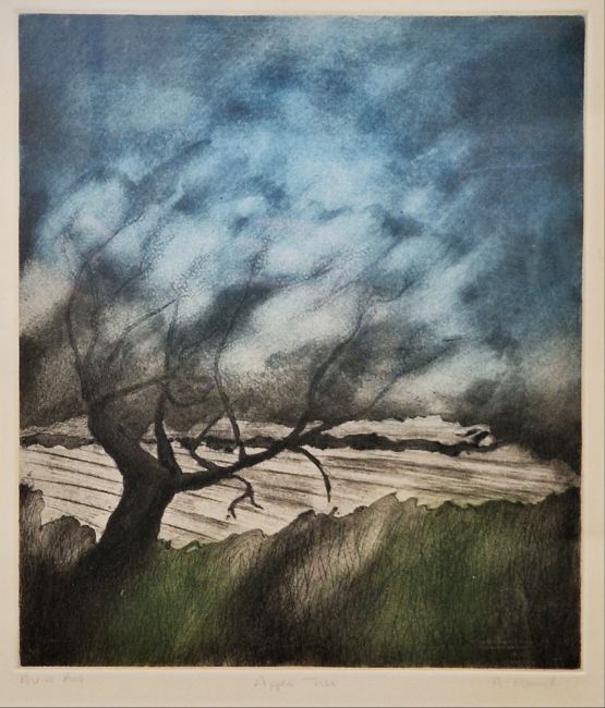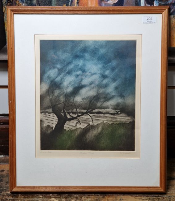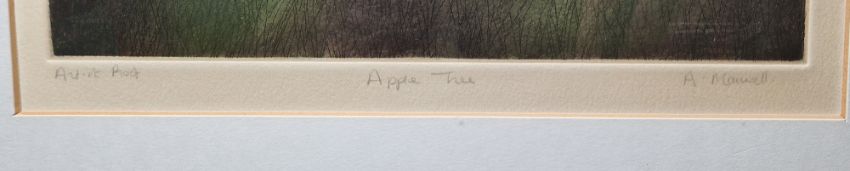 A. Maurell/Maursell? Etching and aquatint "Apple Tree", artist proof, indistinctly signed and titled within margin, framed and glazed, image size 33cm x 28cm Richard Robbins (1927-2009) Mixed media Abstract landscape, signed lower right, framed and glazed, image size 56cm x 78cm