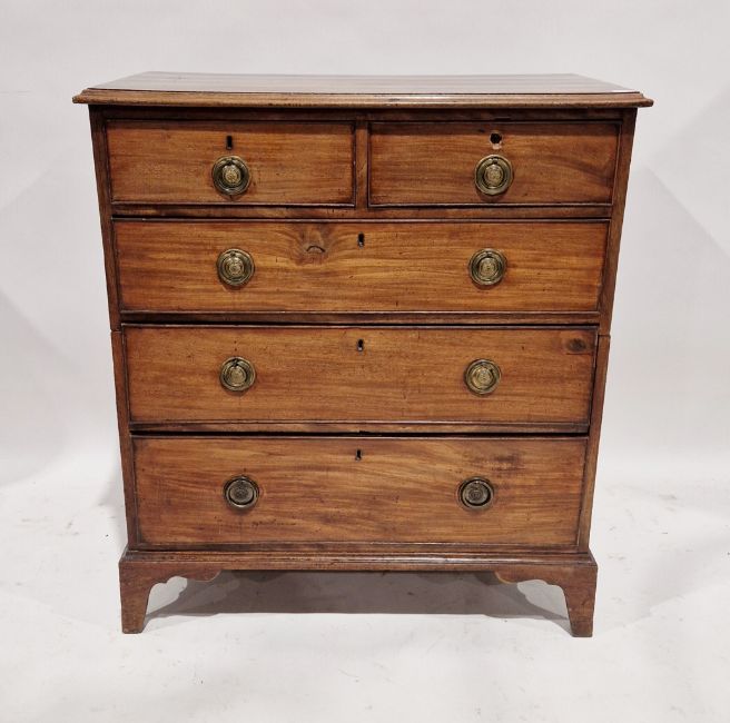 George III mahogany chest of two short and three long graduated drawers with cockbead borders, brass drop ring handles and brass stamped circular backplates, on bracket feet, 99cm high x 88cm wide x 50cm deep