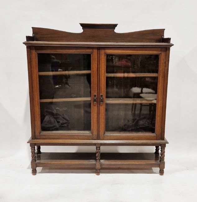Late 19th/early 20th century stained oak glazed bookcase, the two doors opening to reveal two adjustable shelves, 130cm high x 119cm wide x 30cm deep