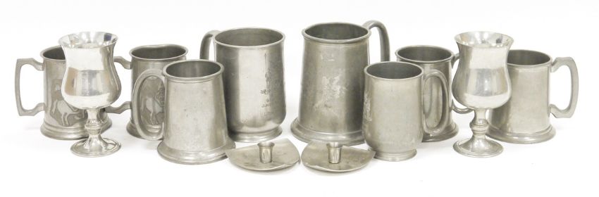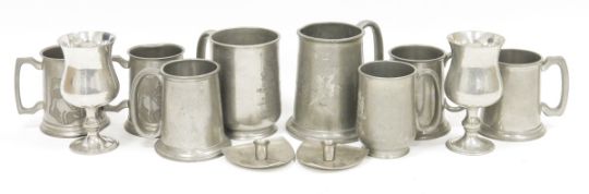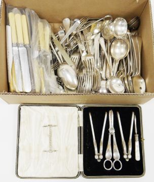 Large assortment of silver plated flatware including spoons, forks, other items including a pair of knife rests and a selection of pewter tankards (2 boxes)