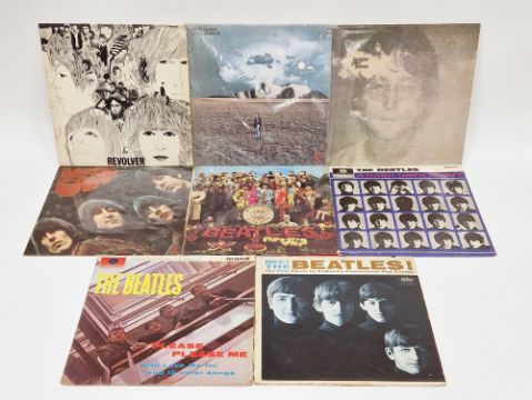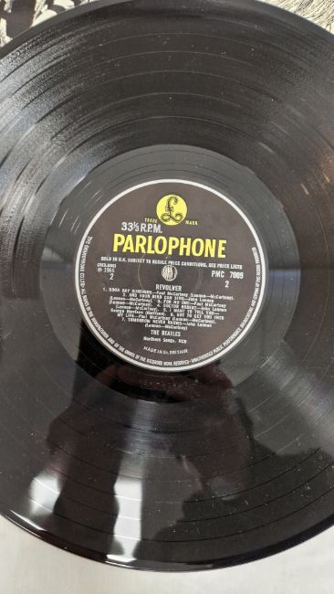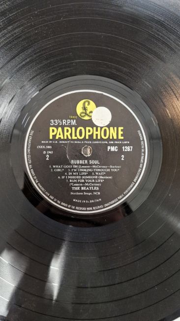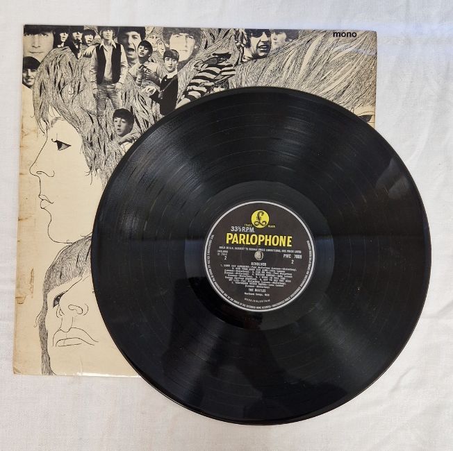 See photos for yellow/black labels. Sleeves have no writing on but all have some scuffs, bumps and creases. Rubber Soul and Hard Day's Night vinyl with some light surface marks. Hard Day's Night with no inner sleeve. Other two vinyls appear in good condition. General wear and tear to all.