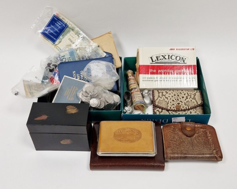 Collection of British and European coinage predominantly mid 20th century, Britains First Decimal Coins x 2, a leather and chrome Montreau cigarette case, a folding brown leather photo album, a small selection of cigarette cards, a Japanese black lacquer writing box and cover and other items