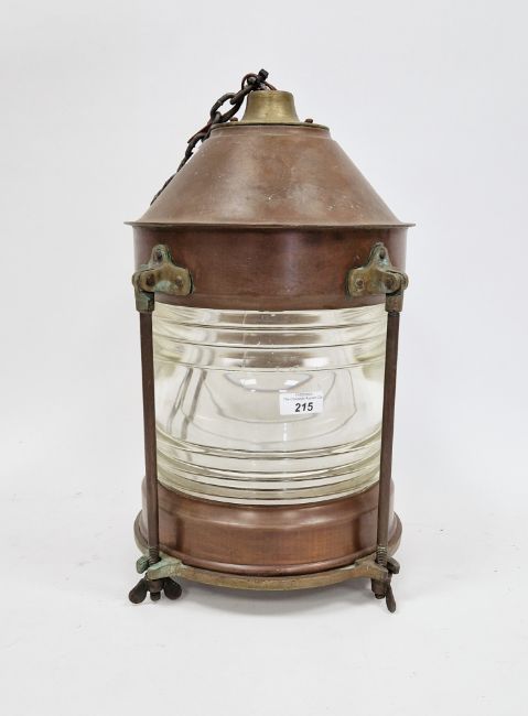 Early 20th century copper and brass-mounted ship's lantern suspended from a chain, 39cm high