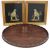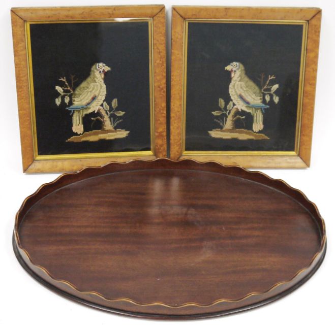 Two framed Victorian needlework tapestry panels of parrots, reserved on a black ground, 23cm x 26.5cm high, together with a Georgian style mahogany oval tray, 56cm wide (3)