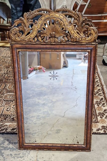 Continental stained wooden and gilt detailed wall mirror with carved and pierced shell and acanthus finial, 78cm high x 43cm wide