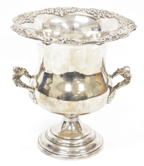 Large modern silver plated wine cooler in the form of a twin-handled urn, 24cm high