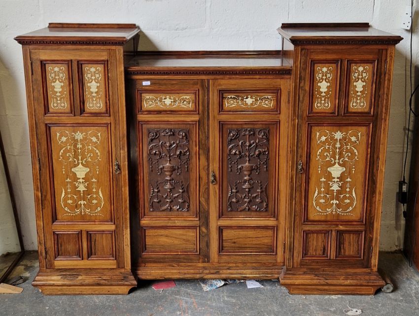 19th century rosewood and ivory inlaid cabinet, the ogee mould top above egg and dart cornice, the centre cupboard enclosed by pair carved and inlaid doors and flanked by pair similar taller cupboards, the whole with carved and ivory inlaid decoration of Berainesque urns and foliate scrolls, having boxwood stringing and on end pedestals, 137cm high x 185cm wide x 50cm deep CITES REF TD1QF4L6