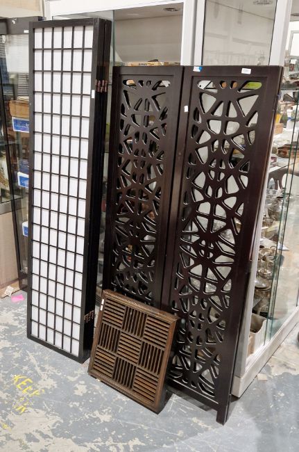 Contemporary four-panelled laser cut wooden Chinese style screen, ebonised, 155.5cm high, a stained wooden square-section panel, pierced with geometric motifs, 45.5cm square and a contemporary Japanese style folding pierced ebonised wooden screen, formed from four folding panels pierced with rectangles and backed with rice paper, 176cm x 44cm (3)