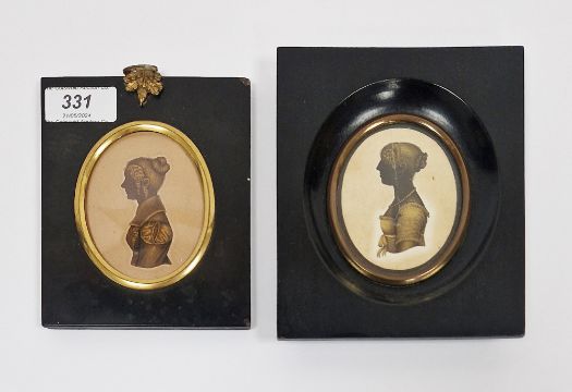 Two 19th century silhouette busts of ladies in period dress with gilt detailing, both mounted in glazed ebonised frames, largest 8.5cm x 6.5cm, smallest 8cm x 6cm (2)